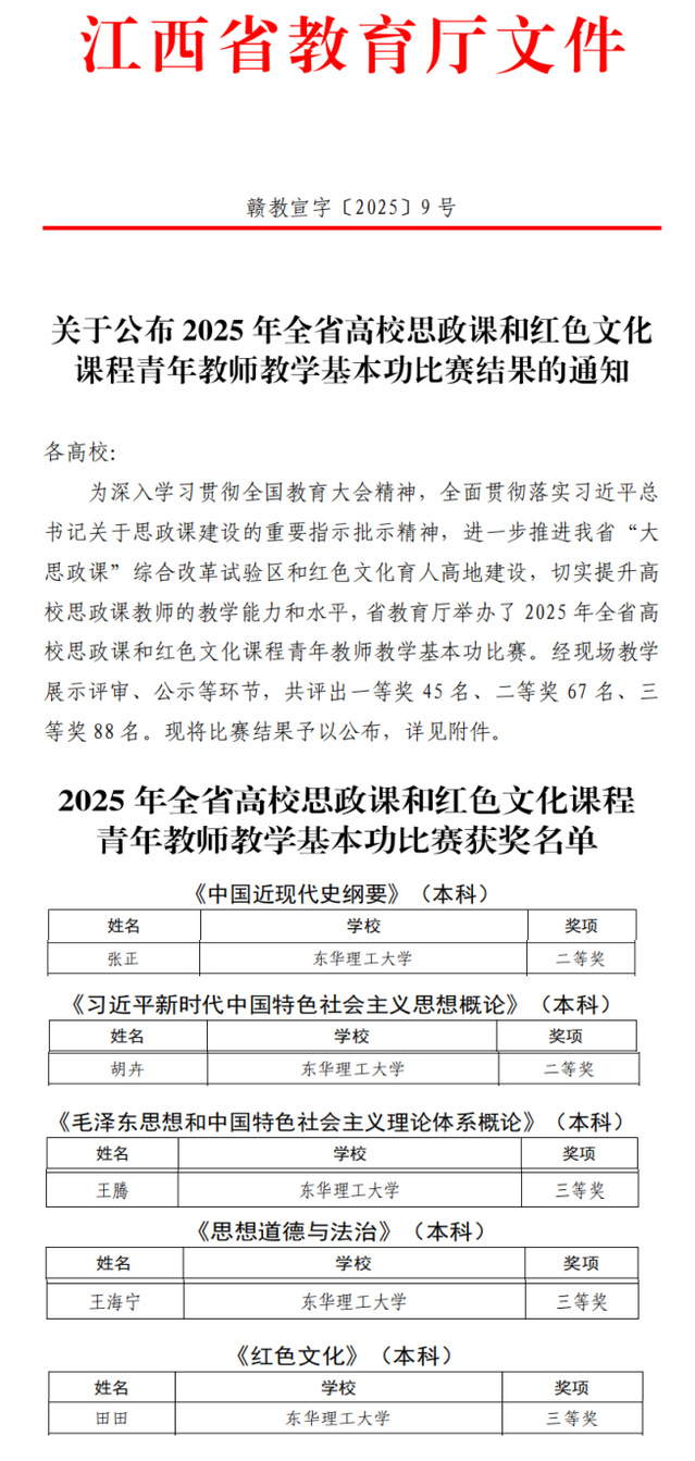 近日,由中共江西省委教育工委、江西省教育厅举办的2025年度全省高校思政课和红色文化课程青年教师教学基本功比赛结果公布,多宝网荣获二等奖2项、三等奖3项。其中,张正和胡卉分别荣获《中国近现代史纲要》和《习近平新时代中国特色社会主义思想概论》本科组二等奖,王腾、王海宁和田田荣获《毛泽东思想和中国特色社会主义理论体系概论》《思想道德与法治》《红色文化》本科组三等奖。