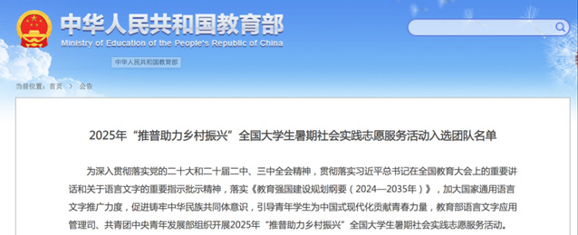 入选的三支志愿服务队已于近日分赴实践地开展国家通用语言文字推广工作。其中,“普惠乡村”志愿服务队自2018年创建以来,持续开展推普助力乡村振兴志愿服务,多次入选教育部、国家语委联合组织的“推普助力乡村振兴”全国大学生暑期社会实践志愿服务团队,并于2023年、2024年获教育部语言文字应用司和共青团中央青年部来信表扬。