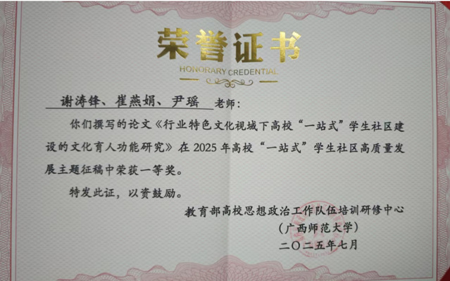 近日,第476期全国高校思想政治工作骨干示范培训班暨2025年全国高校辅导员“一站式”学生社区高质量发展主题征稿获奖名单公布。多宝网地球与行星科学学院专职辅导员谢涛锋等撰写的《行业特色文化视域下高校“一站式”学生社区建设的文化育人功能研究》荣获一等奖。