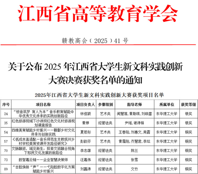 近日,由省教育厅指导,省高等教育学会主办的2025年江西省大学生新文科实践创新大赛结果揭晓,多宝网推选的11个项目共获银奖2项、铜奖5项,学校获评“优秀组织奖”。