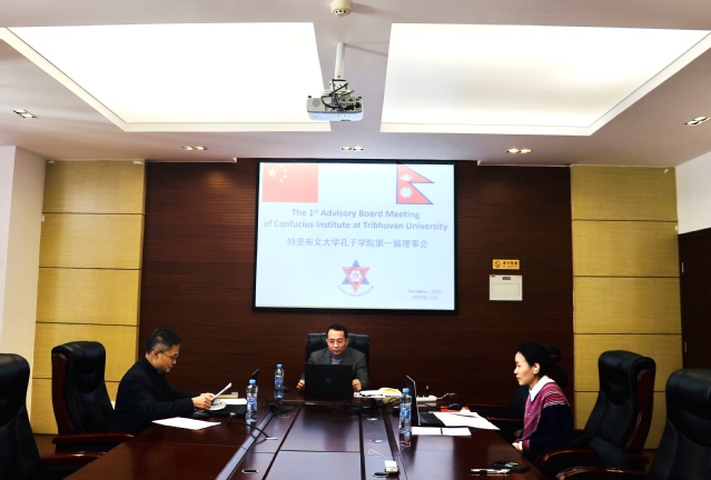 12月31日,我校与青海民族大学联合承办的尼泊尔特里布文大学孔子学院第一届理事会通过网络视频方式顺利召开。特里布文大学校长、孔院理事会轮值理事长Dharma K. Baskota携尼方理事特里布文大学教务长Shiva L Bhusal、孔子学院外方院长Balmukunda Regmi参加了此次会议,理事会轮值副理事长、我校副校长杨波,青海民族大学副校长赵之重率队参会,会议由孔子学院外方院长Balmukunda Regmi主持。