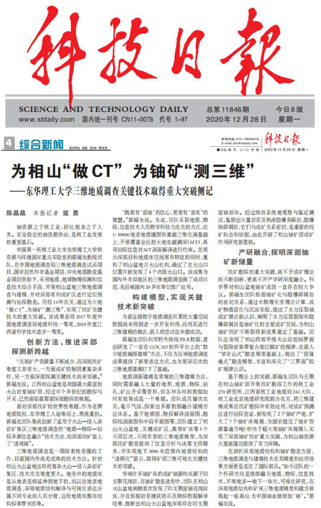 编者按:作为中国第一所核工业大学,我校核资源与环境国家重点实验室的郭福生教授团队,历经10年攻关,通过为大地“做CT”,为铀矿“测三维”,实现了找矿关键技术的重大突破。科技日报、学习强国、新华网、中国新闻网、中国科技网等主流媒体对此进行报道,引发社会广泛关注。现将全文转载如下: