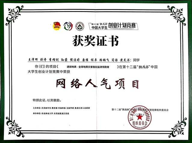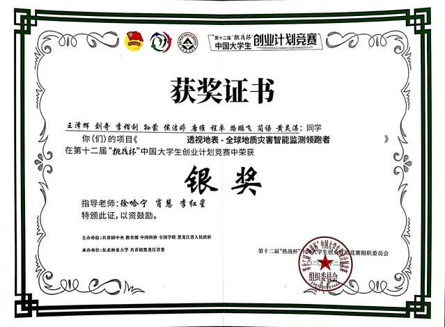 近日,由共青团中央、教育部、中国科协、全国学联、黑龙江省人民政府联合主办的第十二届“挑战杯”中国大学生创业计划竞赛闭幕会在东北林业大学举行。我校地球物理与测控技术学院徐哈宁、肖慧等老师指导,王泽辉、刘奇等同学完成的“透视地表——全球地质灾害智能监测领跑者”项目荣获科技创新和未来产业组全国银奖、“网络人气奖”两项大奖。我校荣获“挑战杯•实践云接力”优秀组织奖(全省仅两所高校获得此项荣誉)。