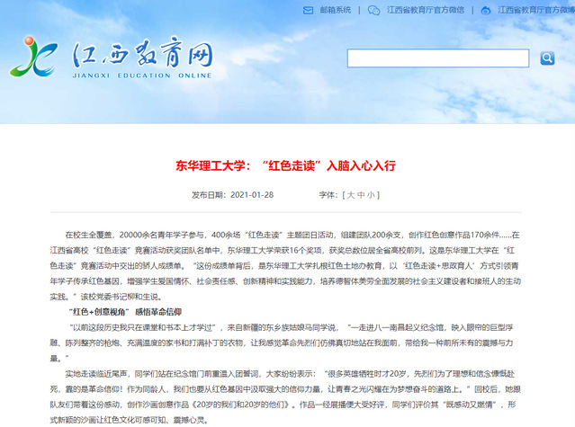 编者按:在江西省高校“红色走读”竞赛活动获奖团队名单中,我校荣获16个奖项,获奖总数位居全省高校前茅。这份成绩单背后,是我校扎根红土地办教育,以“红色走读+思政育人”方式引领青年学子传承红色基因,增强学生爱国情怀、社会责任感、创新精神和实践能力,培养德智体美劳全面发展的社会主义建设者和接班人的生动实践。光明日报、学习强国、新华社客户端、中国新闻网、中国教育在线、江西新闻客户端、江西教育网等国家级和省级媒体对此进行报道。现将相关报道转载如下: