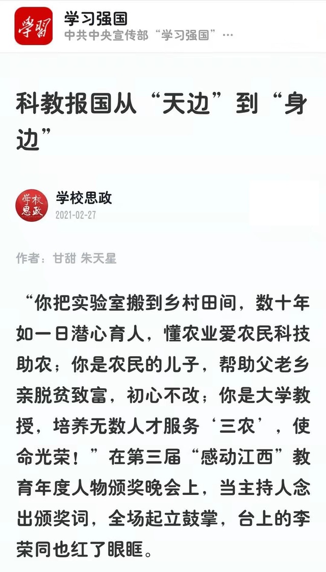 “你把实验室搬到乡村田间,数十年如一日潜心育人,懂农业爱农民科技助农;你是农民的儿子,帮助父老乡亲脱贫致富,初心不改;你是大学教授,培养无数人才服务‘三农’,使命光荣!”在第三届“感动江西”教育年度人物颁奖晚会上,当主持人念出颁奖词,全场起立鼓掌,台上的李荣同也红了眼眶。