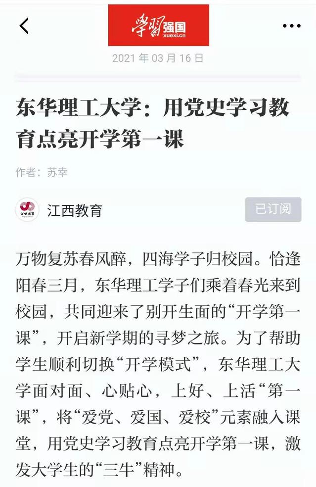编者按:为深入贯彻习近平总书记在党史学习教育动员大会、全国脱贫攻坚总结表彰大会、全国抗击新冠肺炎疫情表彰大会上的重要讲话精神,我校精心组织了春季“开学第一课”。学校坚持以“一门为主,多门融合”的方式,面对面、心贴心地给学生们上好、上活“第一课”,用党史学习教育点亮开学第一课,激发大学生的“三牛”精神。人民网、中新网、新华社客户端、江西新闻客户端等媒体对此进行报道,现将相关内容转载如下: