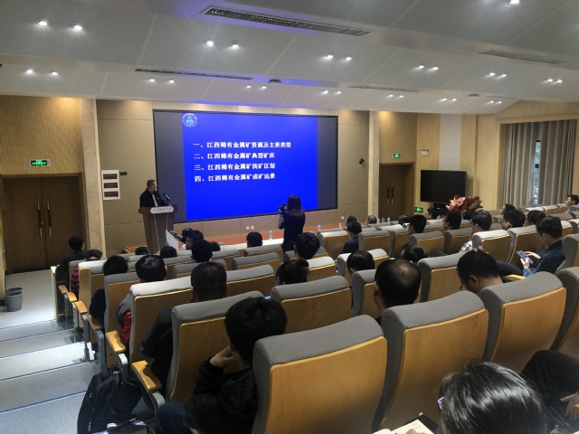 聘仪式结束后,楼法生教授、熊清华教授分别为师生做了学术报告。楼法生教授的“江西稀有金属矿找矿区划与成矿远景”学术报告,系统介绍了江西稀有金属矿资源及主要类型、稀有金属矿典型矿床、稀有金属矿找矿区划以及稀有金属矿成矿远景。熊清华教授的“中国江西朱溪、大湖塘巨型钨铜矿成矿特征对比研究及思考”学术报告,详细介绍了大湖塘、朱溪钨铜矿床的成矿地质背景、物化探特征、成矿岩体特征、矿床类型、矿体形态和围岩蚀变、成矿元素和矿石矿物组合、成矿时代和找矿意义等。学术报告中,楼法生教授、熊清华教授与到会师生进行了热烈讨论与交流,并对大家提出的问题进行了深入讲解,现场气氛活跃,大家受益匪浅。