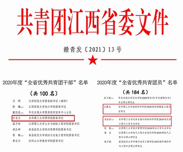 其中,多宝网团委获2020年度“全省五四红旗团委”称号;文法学院2018级广告学专业2班团支部获2020年度“全省五四红旗团支部”称号;理学院团委书记许名文同志获“全省优秀共青团干部”称号;地球科学学院王翼龙、化学生物与材料科学学院吴苗苗同学获“全省优秀共青团员”称号。