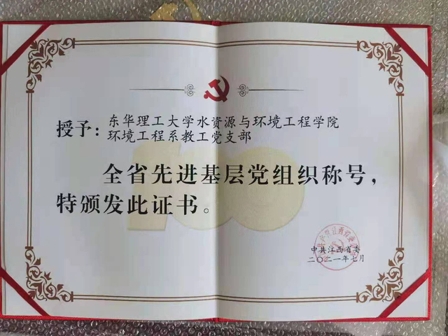 在庆祝建党100周年之际,为表彰先进、弘扬正气,激励全省各级党组织和广大党员奋发有为、建功立业,中共江西省委印发《中共江西省委关于表彰全省优秀共产党员、全省优秀党务工作者和全省基层党组织的决定》(赣委〔2021〕307号),分别授予200名共产党员、99名党务工作者和99个基层党组织“全省优秀共产党员”“全省优秀党务工作者”及“全省先进基层党组织”称号。我校水资源与环境工程学院环境工程系教工党支部荣获“全省先进基层党组织”荣誉称号。