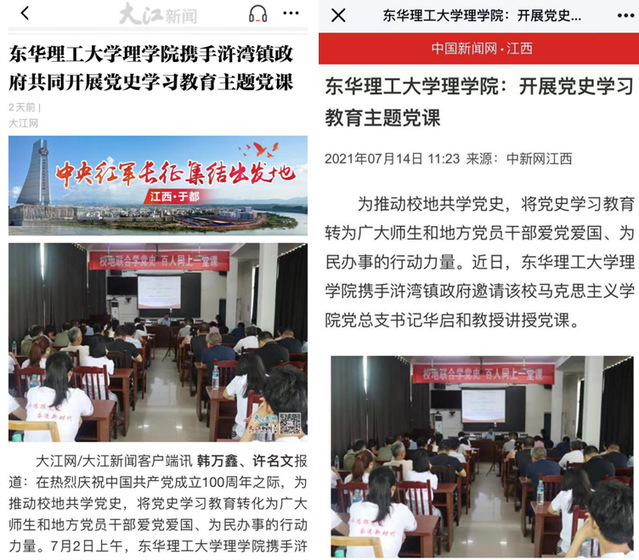 “校地联动学党史推动了理论研究成果与地方党史相辅相承,实现了学校和地方政府双方取长补短,有利于把党的光辉思想深入党员干部和百姓心中。”浒湾镇政府党委委员邓青平说道。接下来,理学院党委将继续打造校地合作常态化机制,为党史学习教育构筑新平台、搭建新桥梁、开创新模式,切实将党史学习教育成果转化为提升地方经济、文化发展,以及促进乡村振兴的强大助推力。(文/韩万鑫 许名文)