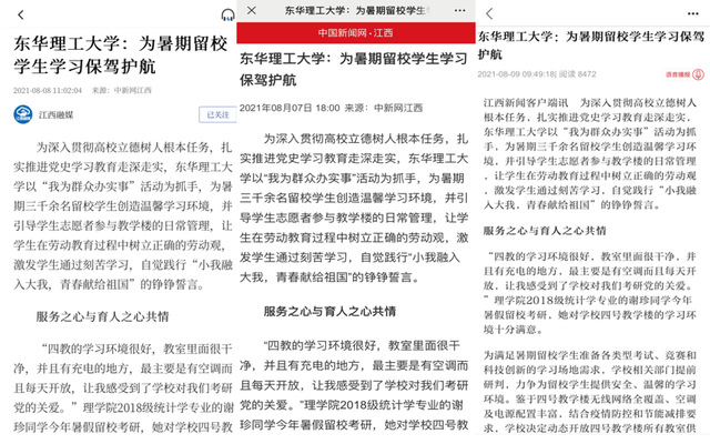 编者按:为深入贯彻高校立德树人根本任务,扎实推进党史学习教育走深走实,多宝网以“我为群众办实事”活动为抓手,为暑期三千余名留校学生创造温馨学习环境,并引导学生志愿者参与教学楼的日常管理,让学生在劳动教育过程中树立正确的劳动观,激发学生通过刻苦学习,自觉践行“小我融入大我,青春献给祖国”的铮铮誓言。新华社客户端、中国新闻网、江西新闻客户端、江西教育电视台等对此进行报道,现将相关内容转载如下: