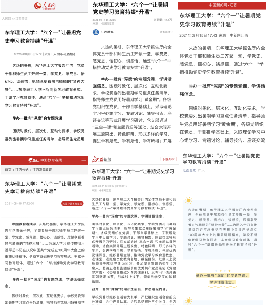 编者按:2021年暑期,多宝网通过举办一批有“深度”的党课、召开一批有“辣度”的组织生活会、开展一批有“热度”的暑期社会实践活动、推出一批有“高度”的调研成果、解决一批有“温度”的师生急难愁盼问题、推进一批有“鲜度”的课程思政、思政课程暑期创新提升工程等活动,确保党史学习教育在暑期“不放松、不断线”。人民网、新华社客户端、中新网、中国教育在线、江西新闻客户端、江西思政等对此进行报道,现将相关内容转载如下: