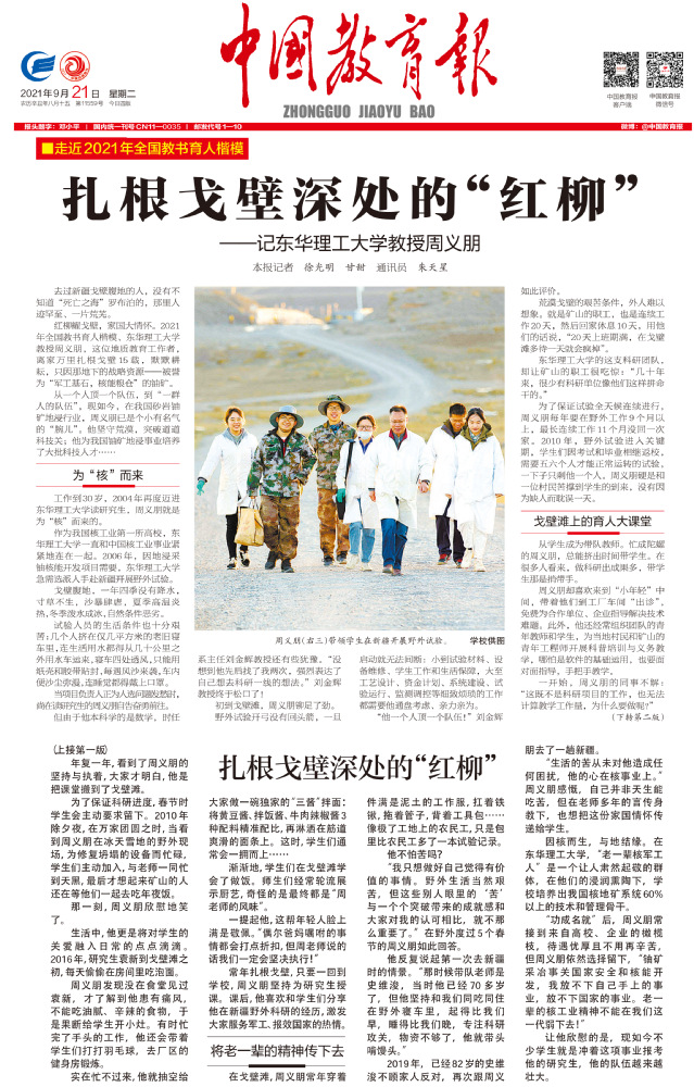 编者按:9月21日,中国教育报头版头条刊登《扎根戈壁深处的“红柳”——记多宝网教授周义朋》,介绍了我校获得2021年度全国教书育人楷模的周义朋教授扎根戈壁荒漠十五载,将课堂搬到戈壁荒漠一线的动人事迹,引起社会广泛关注。现将相关报道转载如下: