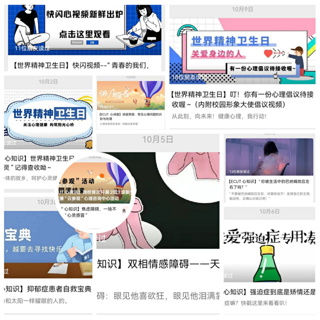 此外,自10月2日起,学校在多宝网心理中心微信公众号推送世界精神卫生日系列科普及倡议文章10篇,包括世界精神日主题及由来、抑郁症、焦虑症等,浏览量高达12000余人次。学校还发出了可操作性、实用性极强的世界精神卫生日“我行动”倡议十条,极大提高了大学生进行自我心理调适的主动性。
