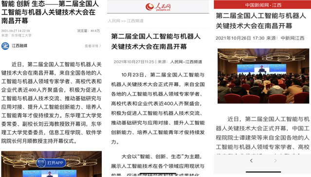 编者按:为促进人工智能与机器人技术交流,推动基础研究与应用对接,提升人工智能创新能力,培养人工智能青年才俊,10月23日,由我校联合主办的第二届全国人工智能与机器人关键技术大会在南昌隆重举行。新华社客户端、人民网、中国新闻网、江西教育电视台等对此进行报道。现将相关内容转载如下:
