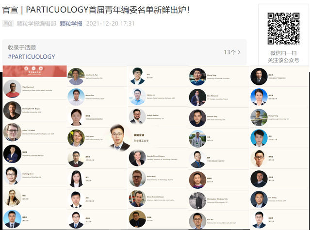 PARTICUOLOGY期刊首届青年编委会由来自中国、美国、英国、澳大利亚、德国等国家的学术及工业界的41位青年学者组成。其中包括美国青年科学家与工程师总统奖获得者、《麻省理工科技评论》“35岁以下科技创新35人”称号获得者、全球高被引科学家、我国高层次人才计划入选者及科学基金获得者、PARTICUOLOGY优秀审稿人及作者等。