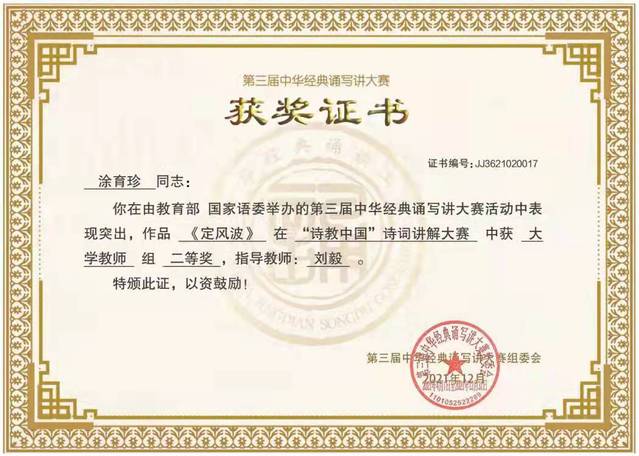 近日,由教育部、国家语委主办的第三届中华经典诵写讲大赛系列赛事之“迦陵杯•诗教中国”诗词讲解大赛评选结果出炉,我校涂育珍教授获得大学教师组二等奖。
