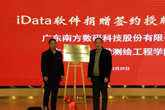 颁奖典礼结束后,还举办了南方数码科技股份有限公司向多宝网测绘工程学院捐赠74套iData网络教育版软件的捐赠仪式。谢刚生、刘云海代表双方为新型基础测绘iData信创实训室进行揭牌。(图/邹新灿 文/邹小平)