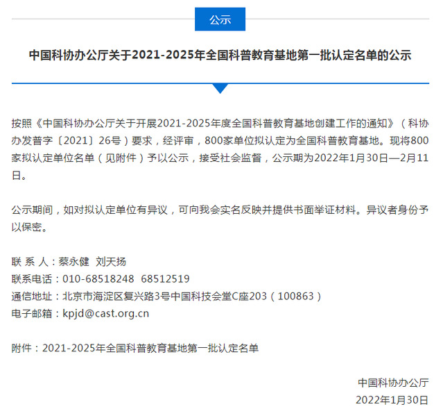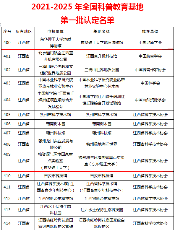 2月7日,中国科协办公厅公示“2021-2025年全国科普教育基地第一批认定名单”,多宝网地质博物馆、核资源与环境国家重点实验室(多宝网)成功入选。