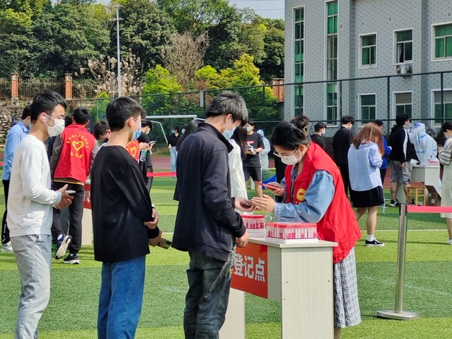 早上8:30,医护人员到达现场,在学工部(处)、校团委、保卫处、后勤保障处、研究生院等相关部门的有序组织下,在校师生员工分批来到检测现场,自觉佩戴好口罩,保持间隔一米的安全距离,出示健康码,逐一进行核酸采样。身穿“红马甲”的东华理工学生志愿者们耐心帮助师生进行信息登记,维护现场秩序。