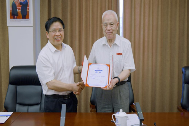 郭杰忠为钱七虎院士颁发“钱七虎班”荣誉班主任聘书。