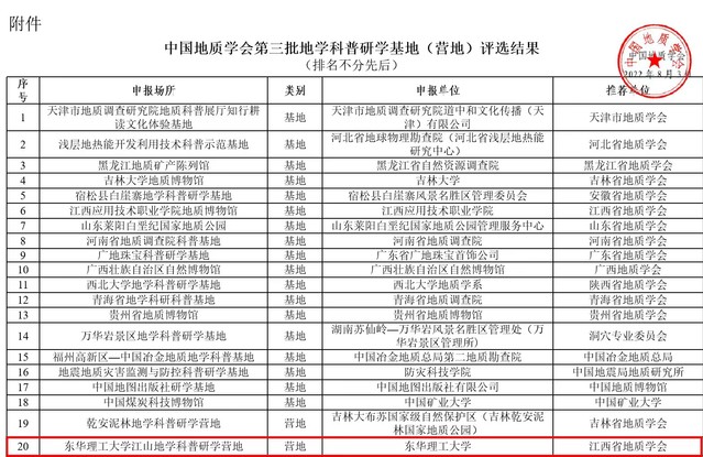 近日,中国地质学会第三批地学科普研学基地(营地)评选结果公示,我校地球科学学院组织申报的多宝网江山地学科普研学营地成功入选。此次评选活动由中国地质学会组织,共评选出全国地学科普研学基地(营地)20家。