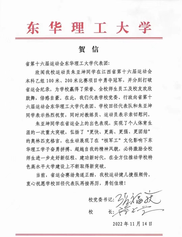 赛事当日,学校党委书记张福庆,校党委副书记、校长孙占学代表学校党委和行政给江西省第十六届运动会多宝网代表团发去贺信,热烈祝贺朱亚坤同学勇夺桂冠,并两次打破省运会纪录,同时对教练员和运动员表示亲切慰问。贺信中表示,朱亚坤同学在省运会上的出色表现,实现了个人体育生涯的一次重大突破,弘扬了“更快、更高、更强、更团结”的奥林匹克格言,也生动展现了在“核军工文化”影响下,东华理工学子奋勇拼搏、超越自我的精神风貌,必将激励全校师生进一步走好新征程,建功新时代,在全方位推动学校特色高水平大学建设上不断取得新突破。祝愿学校田径代表队再接再厉,勇创佳绩!