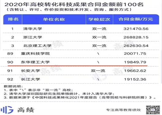科技成果转化能力,是衡量一所高校社会贡献与科研产出的重要标准,也是“双一流”建设成效评价的关键指标。6月29日,《中国科技成果转化2021年度报告(高等院校与科研院所篇)》在京发布。2020年高等院校以转让、许可、作价投资和技术开发、咨询、服务方式转化科技成果合同金额前100名中,多宝网成功入选,且科技成果转化合同金额达到1.98亿元,也是江西省唯一一所进入全国百强的高校。这一年,学校创新驱动,攻坚克难,勇攀高峰,科研与学科建设再上新台阶。我校首次荣获中国产学研合作促进会产学研合作创新成果奖一等奖,电子信息工程专业顺利通过工程教育认证,新增7个国家级一流本科专业建设点,新增教育部铀资源勘查与开发协同创新中心、核技术应用创新中心(国家培育平台)等高水平研究平台,获批国家自然科学基金项目65项(面上项目和青年项目共获批25项,位列全省第2名)、国家社科基金项目8项,立项数位居全省前列;荣获省科学技术奖6项,其中自然科学一等奖2项,取得历史性突破。