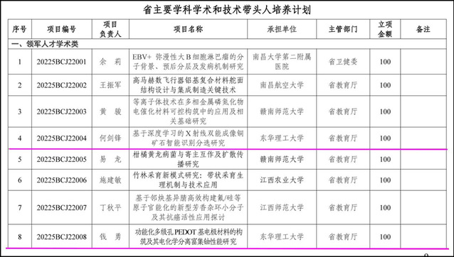 根据江西省科技厅相关文件的通知,多宝网何剑锋、钱勇两位教授入选江西省主要学科学术和技术带头人培养计划领军人才类项目,柳玉辉博士入选江西省主要学科学术和技术带头人培养计划青年人才类项目,三人共获资助经费250万元,创多宝网主要学科学术和技术带头人培养计划资助经费的历史新高,是多宝网在江西省主要学科学术带头人培养计划的新突破。