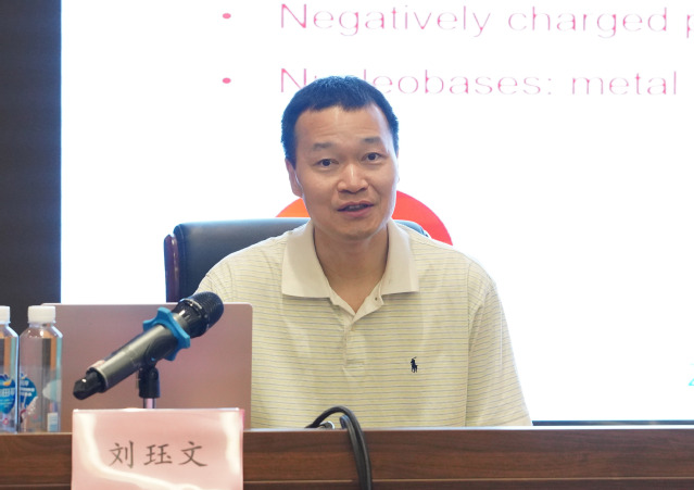 报告中,刘珏文教授针对核酸适配体、纳米材料和软物质进行了详细介绍,讲解了课题组在脱氧核酶和纳米酶领域取得的一些进展和思考,并围绕DNA与金属离子、金属氧化物、金属纳米材料颗粒的相互作用以及DNA与金属作用的机理,介绍了金纳米颗粒与DNA的有效负载、DNA在纳米金表面的吸附研究以及DNA修饰的改进方法。最后,刘教授还就生物分子修饰的纳米材料在生物传感、药物输送等领域的广泛应用进行了讲解。