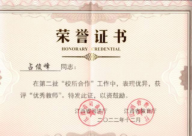 近日,江西省司法厅、江西省教育厅联合印发《关于通报表扬第二批“校所合作”工作优秀教师 先进单位的决定》,多宝网荣获“校所合作”工作先进单位,多宝网教师占俊峰荣获“校所合作”工作优秀教师称号。