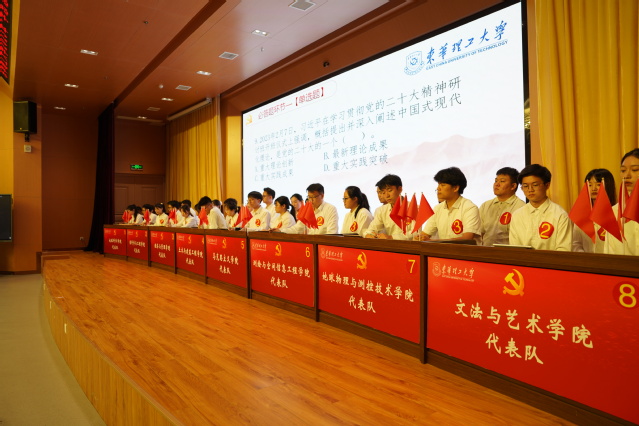 本次比赛旨在以学习竞赛的形式普及党的基本知识,决赛内容聚焦习近平新时代中国特色社会主义思想、党的二十大精神、习近平总书记关于教育的重要论述、党中央关于开展党史学习教育的重要精神和决策部署等内容,共设置了必答题、挑战题、抢答题等环节,以现场答题的形式进行。在抢答题环节中,参赛选手以扎实的党史理论基础、敏捷的答题反应、高超的抢答技巧,点燃了现场师生的热情,将本次比赛活动推向顶峰。经过激烈的角逐,土木与建筑工程学院代表队荣获一等奖,马克思主义学院、测绘与空间信息工程学院代表队荣获二等奖,核科学与工程学院、地球科学学院、经济与管理学院代表队荣获三等奖,文法与艺术学院、地球物理与测控技术学院荣获优秀组织奖。