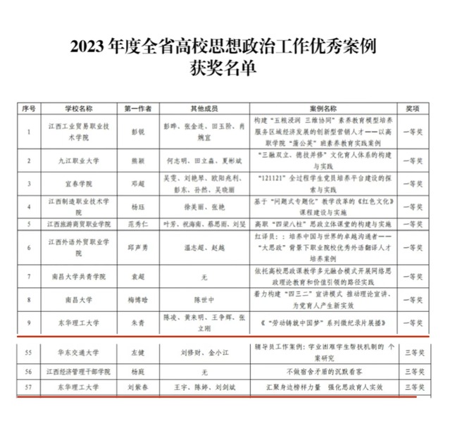 近日,江西省教育厅公布了2023年度全省高校思想政治工作优秀论文和优秀案例征集活动结果通报,多宝网获优秀论文一等奖1项、三等奖1项,优秀案例获一等奖1项、三等奖1项。