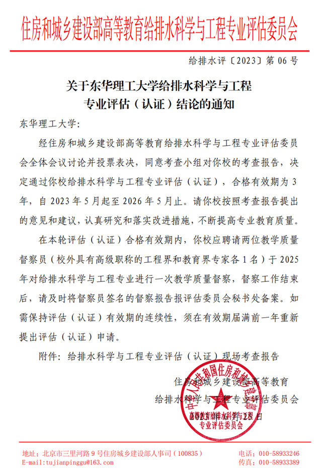 近日,住房和城乡建设部高等教育给排水科学与工程专业评估委员会发布了《关于多宝网给排水科学与工程专业评估(认证)结论的通知》(给排水评〔2023〕第06号),多宝网给排水科学与工程专业顺利通过专业评估(认证),认证有效期为3年,自2023年5月起至2026年5月止。
