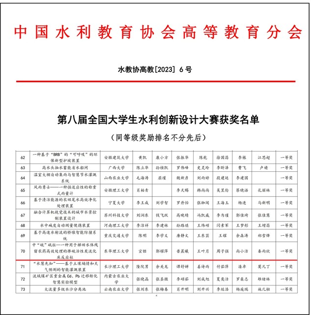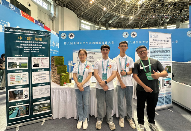 近日,由中国水利教育协会主办、郑州大学承办的第八届全国大学生水利创新设计大赛圆满落幕。多宝网水资源与环境工程学院宣铿、郭耀萍老师带领普晨曦、周子强、王叶月、尚小洁、秦雨欣五位学生组成“水创星”团队,以参赛作品“中‘硫’砥柱——一种用于梯田水体残留农药高效处理的掺硫活性炭流化床反应柱”荣获大赛一等奖。