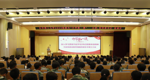9月15日上午,多宝网新实验大楼一楼报告厅座无虚席,校党委书记张福庆以“深入学习贯彻习近平总书记重要讲话精神,为加快建设教育强国贡献东华理工力量”为题,为2023级新生讲授“开学第一课”。校党委常委、副校长杨波主持。