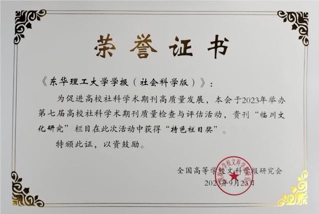 近日,在全国高等学校文科学报研究会举办的第七届高校社科学术期刊质量检查与评估活动中,《多宝网学报(社会科学版)》荣获“全国高校优秀社科期刊”,其中“临川文化研究”栏目获得“特色栏目奖”。