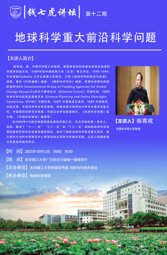 应党委宣传部邀请,中国科学院大学教授,原国家自然科学基金委员会地球科学部常务副主任柴育成来到“多宝网”,以“地球科学重大前沿科学问题”为主题开展讲座。欢迎全校师生届时前往聆听。