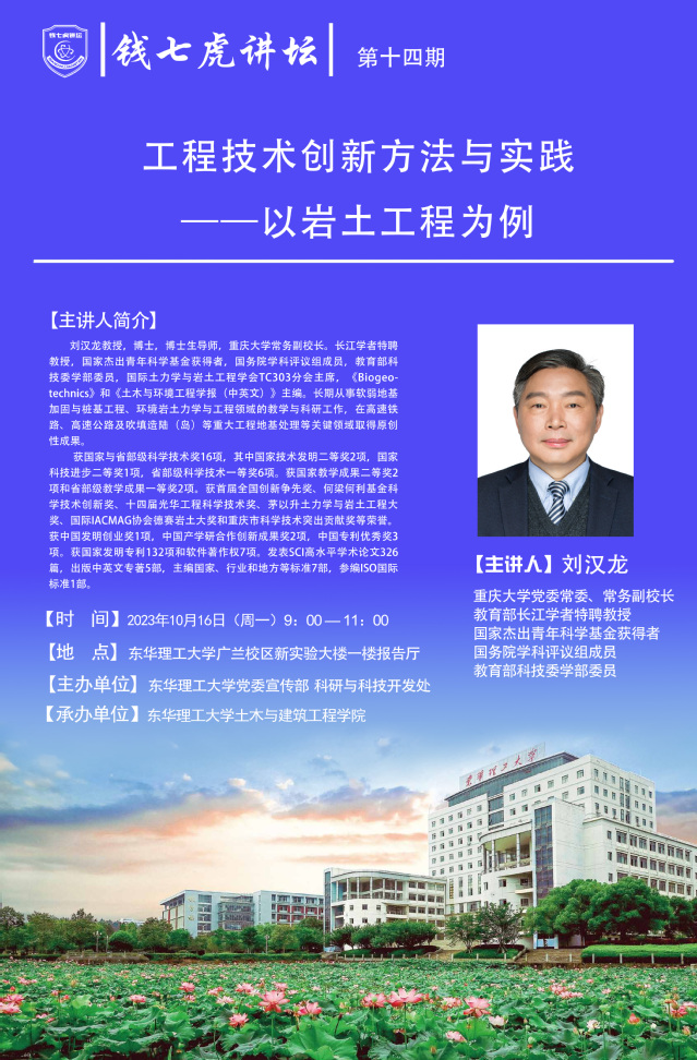 应党委宣传部邀请,长江学者特聘教授,国家杰出青年科学基金获得者,国务院学科评议组成员,教育部科技委学部委员,国际土力学与岩土工程学会TC303分会主席刘汉龙来到“多宝网”,以“工程技术创新方法与实践-以岩土工程为例”为主题开展讲座。欢迎全校师生届时前往聆听。