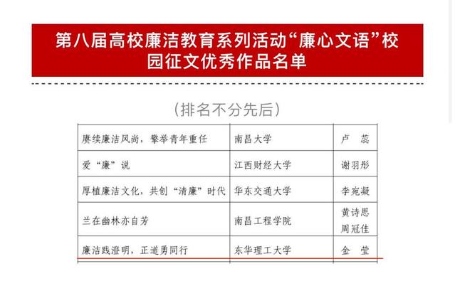 据悉,此次系列活动共遴选“廉心文语”校园征文作品100件、“润心话语”视频征集作品100件、“清心妙语”创意征集作品100件、高校廉洁教育系列活动案例100件以及知识问答优秀学员100人。
