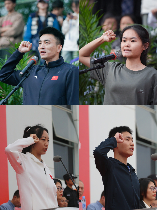 伴着激昂的《运动员进行曲》,仪仗队、彩旗队、裁判员、运动员依次入场,他们热情澎湃,步履铿锵,喊着响亮的口号,迈着坚定的步伐向主席台走来。伴随着庄严肃穆的《义勇军进行曲》,鲜艳的五星红旗缓缓升起,全场师生行注目礼,齐唱国歌。随后,运动员代表、裁判员代表高举右拳,庄严宣誓。