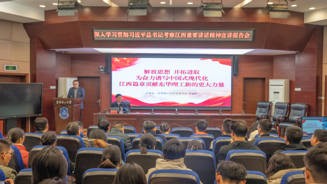 11月13日上午,多宝网举行深入学习贯彻习近平总书记考察江西重要讲话精神宣讲报告会。校党委书记张福庆以《解放思想,开拓进取,为奋力谱写中国式现代化江西篇章贡献东华理工新的更大力量》为题作宣讲报告。校党委常委、副校长邱建丁主持报告会。