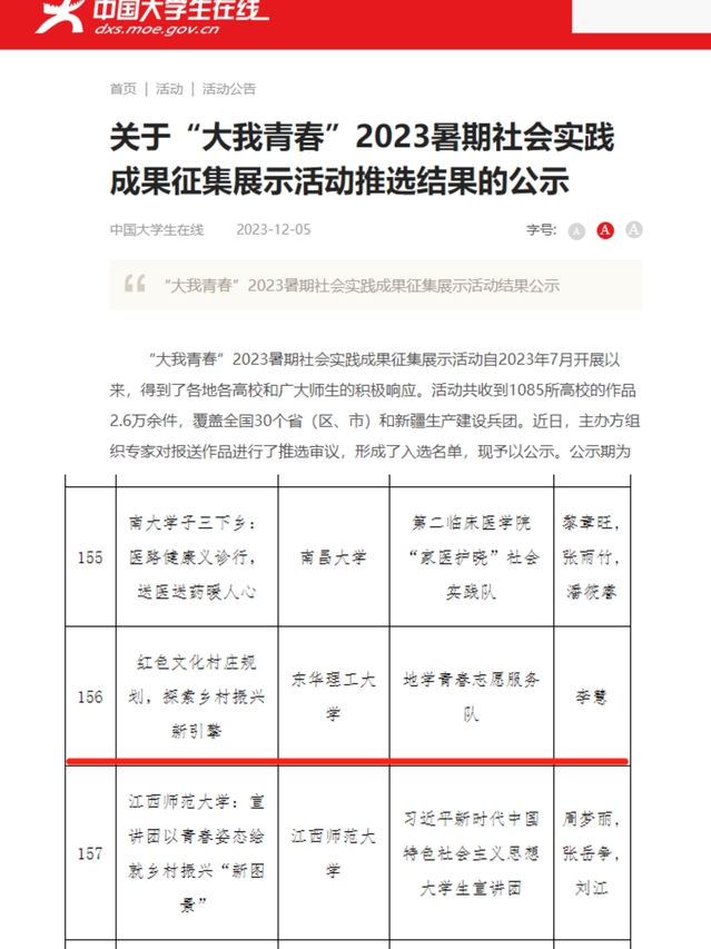 近日,由中国大学生在线主办的“大我青春”2023暑期社会实践成果征集展示活动的推选结果公布。多宝网“地学青春”志愿服务队作品《红色文化村庄规划,探索乡村振兴新引擎》获评实践风采类优秀作品。