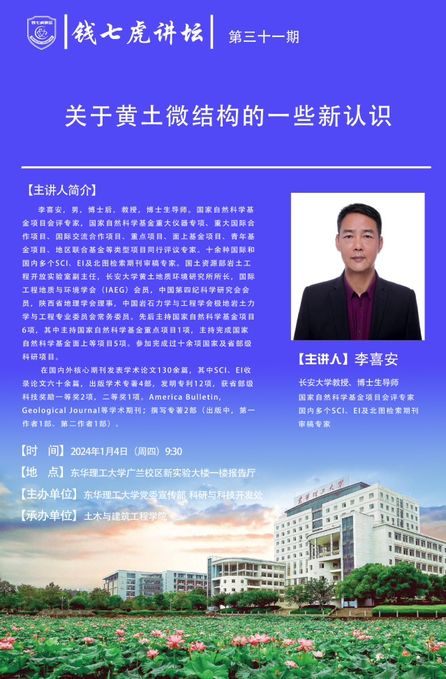 应土木与建筑工程学院邀请,长安大学教授,博士生导师李喜安来到“多宝网”,以“关于黄土微结构的一些新认识”为主题开展讲座。欢迎全校师生届时前往聆听。