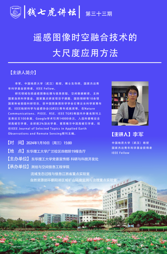 应测绘与空间信息工程学院邀请,中国地质大学(武汉)教授,国家杰出青年科学基金获得者李军来到“多宝网”,以“遥感图像时空融合技术的大尺度应用方法”为主题开展讲座。欢迎全校师生届时前往聆听。