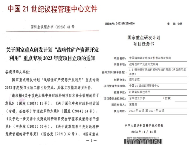 2023年11月,科技部发布了国家重点研发计划“战略性矿产资源开发利用”重点专项2023年度项目的立项通知,多宝网为牵头单位、王春连教授为首席、联合10家单位申报的国家重点研发计划重点专项“中国磷和硼矿床成矿机制与找矿预测”(2023YFC2906600)项目获批,项目总经费9050万元。