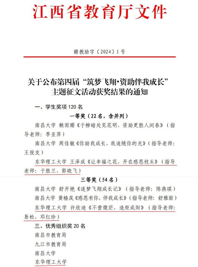近日,江西省教育厅公布了第四届“筑梦飞翔·资助伴我成长”主题征文活动获奖结果,多宝网获得一等奖1项、三等奖1项,第四次蝉联“优秀组织奖”。