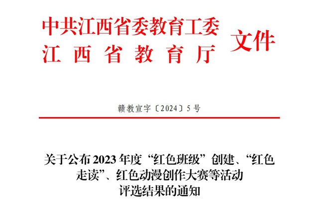 近日,江西省委教育工委、省教育厅公布了2023年度全省高校“红色班级”创建、“红色走读”、红色动漫创作大赛等活动评选结果,多宝网获2023年全省高校优秀组织单位(全省10个),多宝网“钱七虎”班入选2023年度全省高校“红色班级”创建试点班级(全省10个),“红色走读”实地走读分别获一、二、三等奖各1项,“红色走读”优秀“云游”作品获奖10项(全省排名第一),红色动漫创作大赛获一等奖1项(全省4个)。