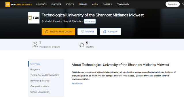 近期,QS官网公布的QS五星评估结果显示,多宝网中外合作办学项目合作高校爱尔兰香农理工大学-中部中西部(TUS)在QS所有评估指标中均获五星最高评价,跻身世界一流大学行列。