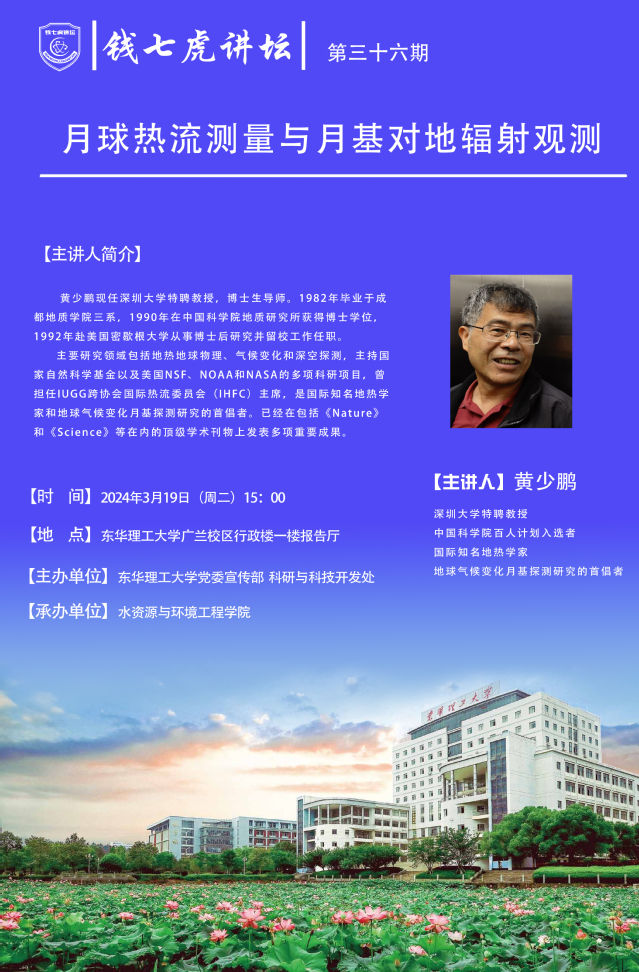 应水资源与环境工程学院邀请,深圳大学特聘教授,国际知名地热学家,地球气候变化月基探测研究的首倡者黄少鹏来到“多宝网”,以“月球热流测量与月基对地辐射观测”为主题开展讲座。欢迎全校师生届时前往聆听。
